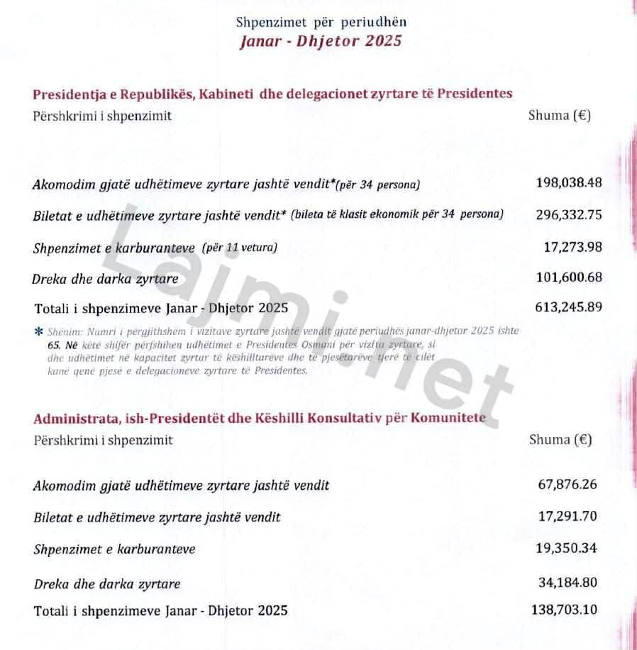 Këto shpenzime marramendëse të Osmanit me ekipë, janë pjesë e buxhetit të shtetit të vitit 2025, saktësisht 4.2 milionë eurove që u ndanë për Presidencën.