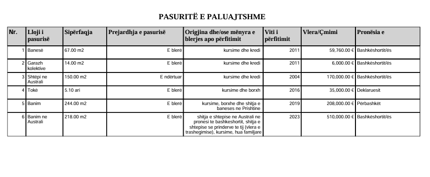 Ajo ka deklaruar banesë në vlerë rreth 60 mijë eurove në pronësi të bashkëshortit, garazh në vlerë rreth 6 mijë euro në pronësi të bashkëshortit, shtëpi në Australi në vlerë 170 mijë euro në pronësi të bashkëshortit, tokë në vlerë 35 mijë euro në pronësi të saj, banim në vlerë 208 mijë euro në pronësi të përbashkët dhe banim në Australi në vlerë 510 mijë euro në pronësi të bashkëshortit. /Lajmi.net/