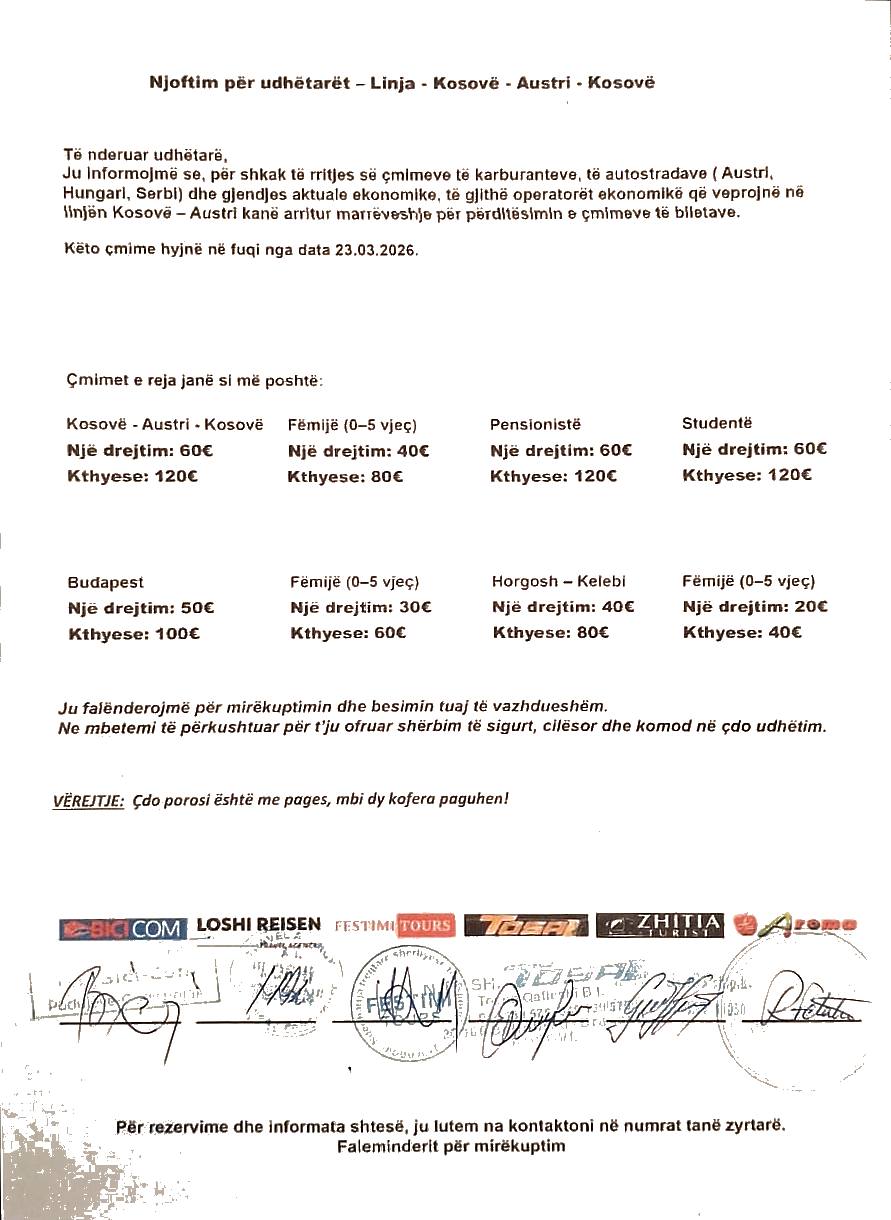 Pas rritjes së çmimit të derivateve, specifikisht të naftës, po pasojnë rritjet e tjera. Kompanitë turistike që operojnë në linjën Kosovë-Austri, kanë njoftuar se është rritur çmimi i biletave për udhtarë. Këto çmime të reja do të hyjnë në fuqi nga data 23 mars 2026, pra nga sot. Këto do të jenë çmimet e reja: