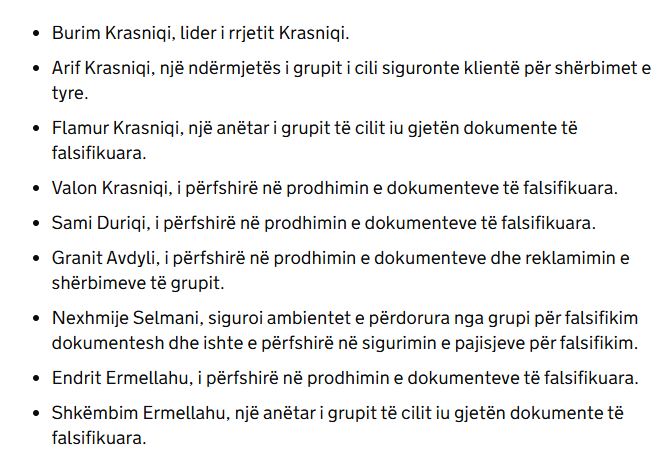 Sipas Mbretërisë së Bashkuar, personat e sanksionuar janë: “Burim Krasniqi, që përshkruhet si udhëheqës i rrjetit Krasniqi; Arif Krasniqi, që thuhet se ishte ndërmjetës i grupit që siguronte klientë për shërbimet e tyre; Flamur Krasniqi, anëtar i grupit të cilit iu gjetën në posedim dokumente të falsifikuara; Valon Krasniqi, i përfshirë në prodhimin e dokumenteve të falsifikuara; Sami Duriqi, i përfshirë në prodhimin e dokumenteve false; Granit Avdyli, i përfshirë në prodhimin e dokumenteve dhe reklamimit të shërbimeve të grupit; Nexhmie Selmani, e cila ka ofruar objektin që ka përdorur grupi për të falsifikuar dokumente dhe po ashtu është përfshirë në ofrimin e pajisjeve për falsifikim; Endrit Emerllahu, i përfshirë në prodhimin e dokumenteve të falsifikuara; si dhe Shembim Emerllahu, anëtar i grupit të cilit iu gjetën dokumente të falsifikuara”.