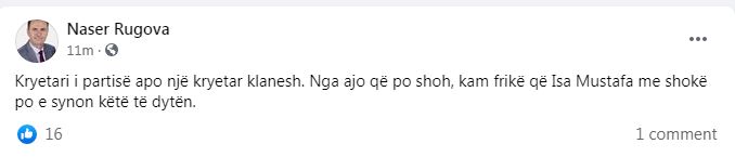 “Kryetari i partisë apo një kryetar klanesh. Nga ajo që po shoh, kam frikë që Isa Mustafa me shokë po e synon këtë të dytën”, ka shkruar Rugova në Facebook.
