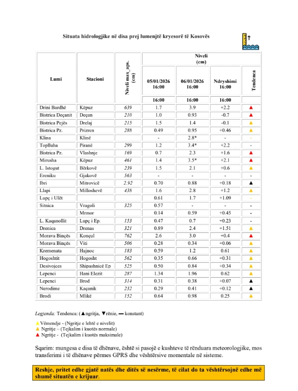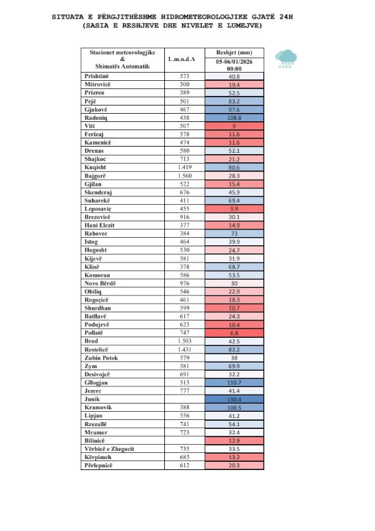 Sipas Institutit Hidrometeorologjik të Kosovës (IHMK), gjatë periudhës nga 5 deri më 6 janar 2026, në territorin e Kosovës është regjistruar një sasi mesatare reshjesh prej 43 mm. Në bazë të të dhënave sipas pellgjeve lumore, reshjet kanë qenë më të mëdha në: Drini Bardhë me 76.2 mm, Lepenci me 47.9 mm, Ibri me 27.8…