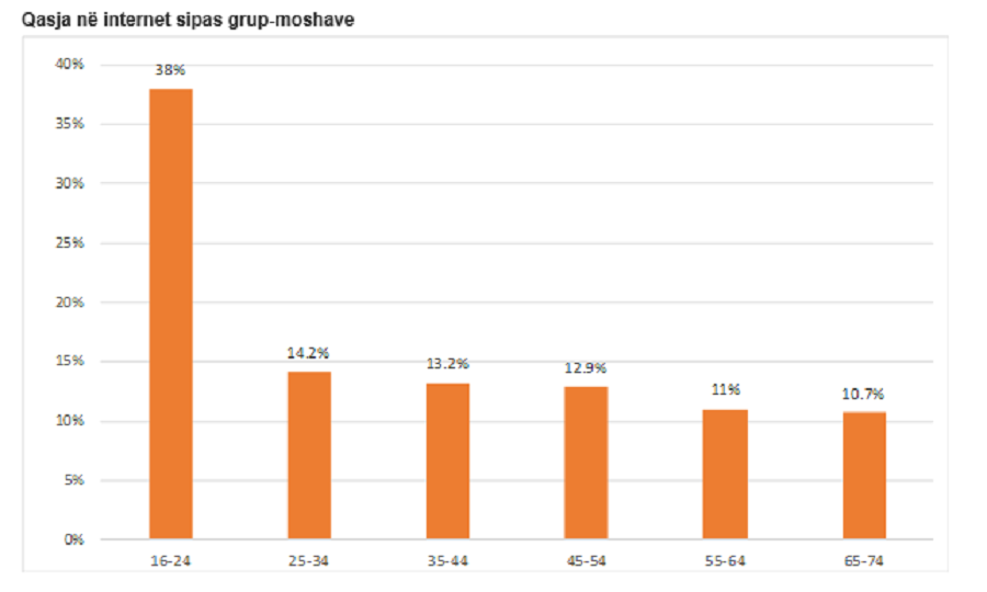 Sipas Agjencisë së Statistikave të Kosovës, grup-mosha me përqindjen më të lartë të qasjes në internet është grup mosha 16-24 vjeç me rreth 38 %, pasuar nga grup-mosha 25-34 vjeç me 14,2%. Ndërkohë me përqindjen më të vogël të qasjes në internet ishte grup-mosha 65-74 me rreth 10,7%.