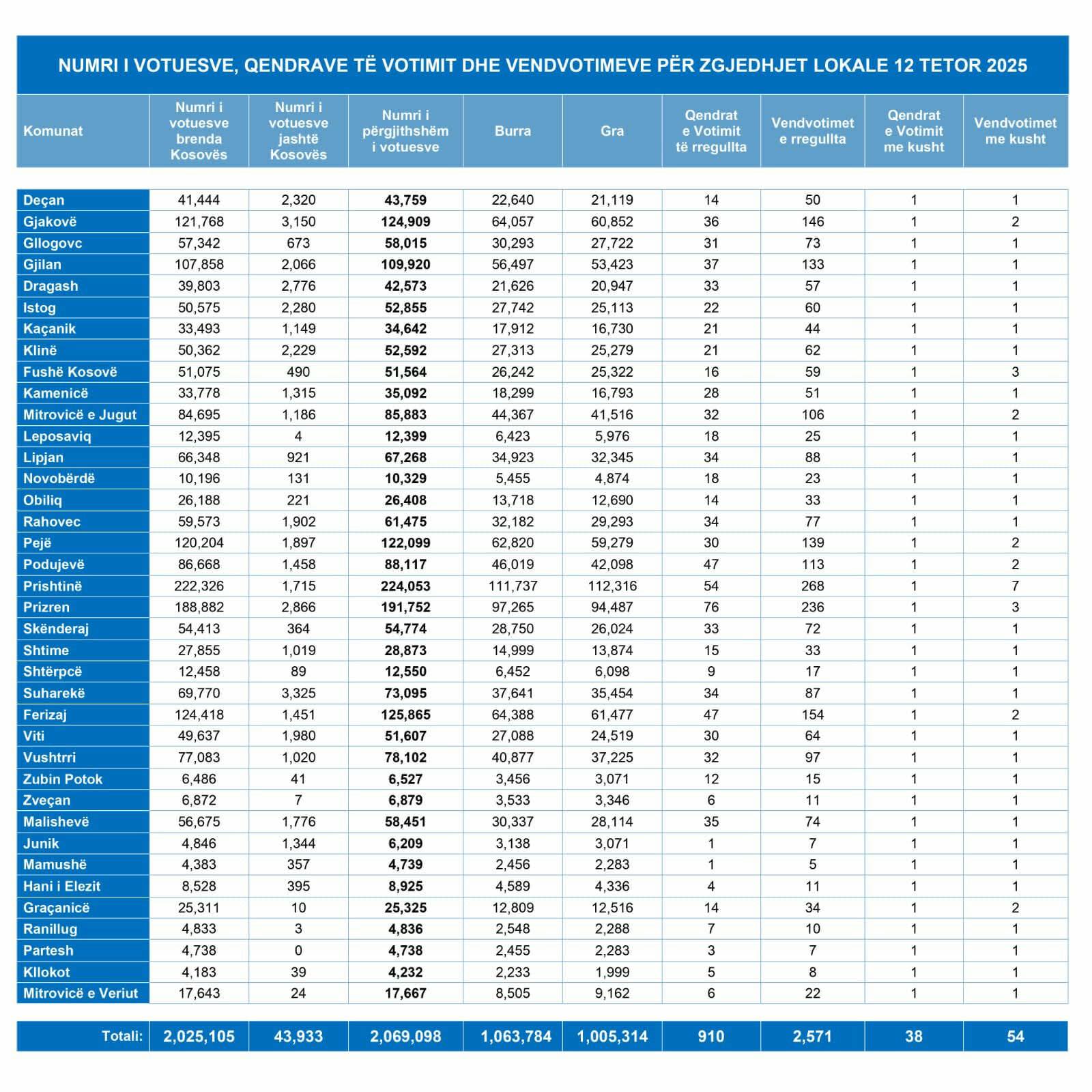Numri i përgjithshëm i votuesve brenda dhe jashtë Kosovës është 2 milionë e 69 mijë e 98 persona.