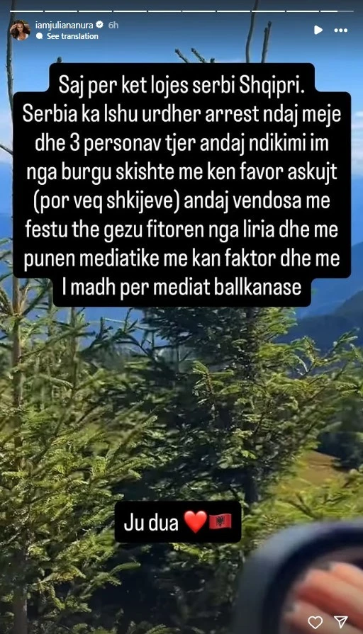 Juliana Nura, ish-banorja e njohur e Big Brother VIP Kosova, ka reaguar publikisht pas ndeshjes Serbi–Shqipëri, ku ajo nuk mori pjesë për arsye sigurie.