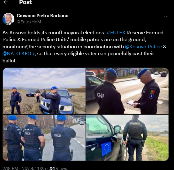 ‘’Ndërsa Kosova po zhvillon raundin e dytë të zgjedhjeve për kryetarë komunash, patrullat mobile të Njësive të Policisë së Formuar dhe të Policisë së Formuar Rezervë të EULEX janë në terren, duke monitoruar situatën e sigurisë në bashkëpunim me Policinë e Kosovës dhe KFOR, në mënyrë që çdo qytetar me të drejtë vote të mund ta ushtrojë lirshëm dhe paqësisht të drejtën e tij për të votuar’’, është thënë nga Barbano. /Lajmi.net/