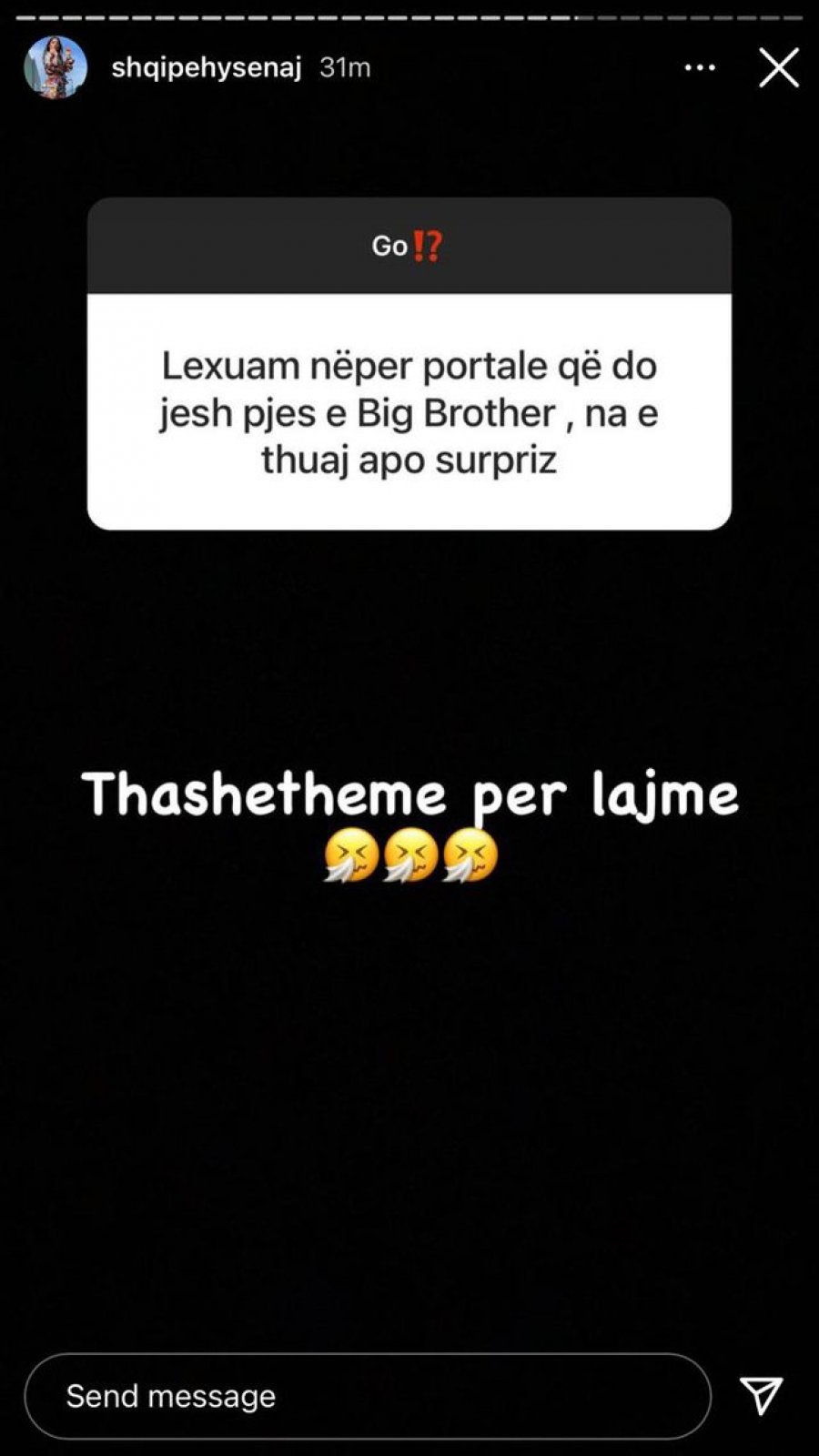 “Lexuam nëpër portale që do jesh pjes e Big Brother, na e thuaj apo surpriz”, i shkroi një ndjekës.