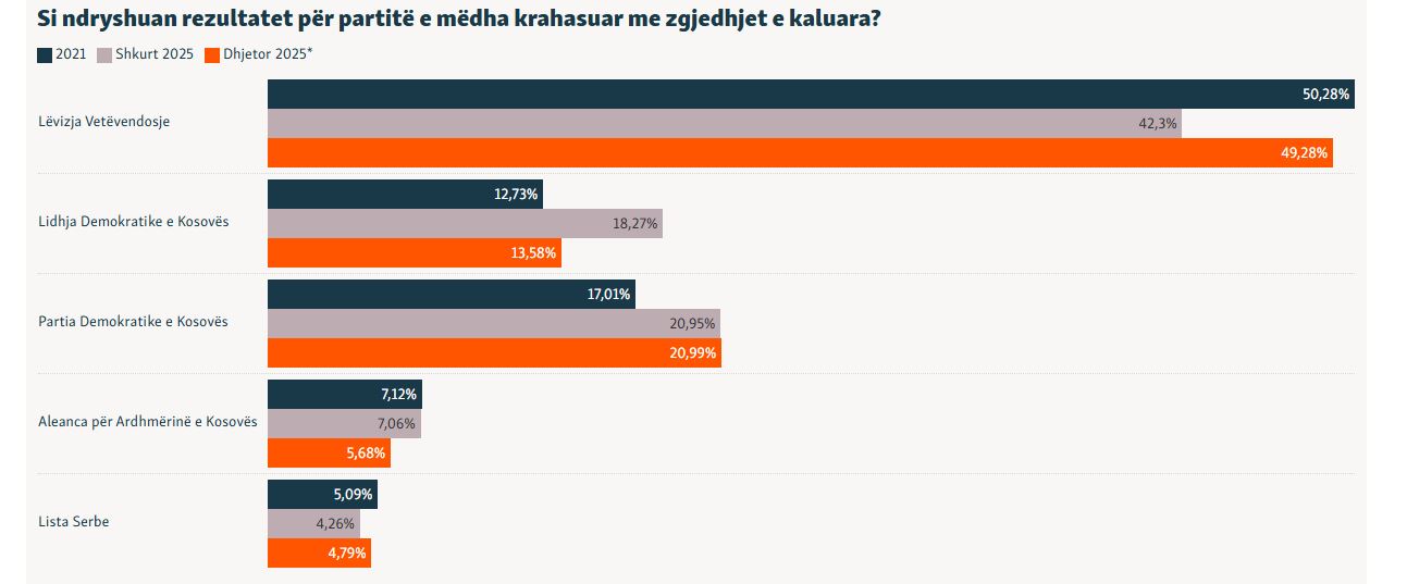 Më 2021, LDK mori 12.73%, kurse në shkurt mori 18.27% ndërsa mbrëmë doli me vetëm 13.58%, transmeton lajmi.net.