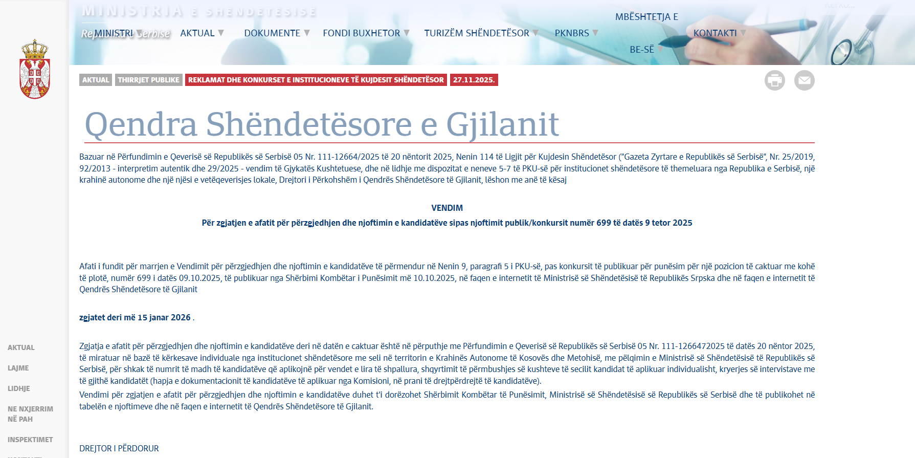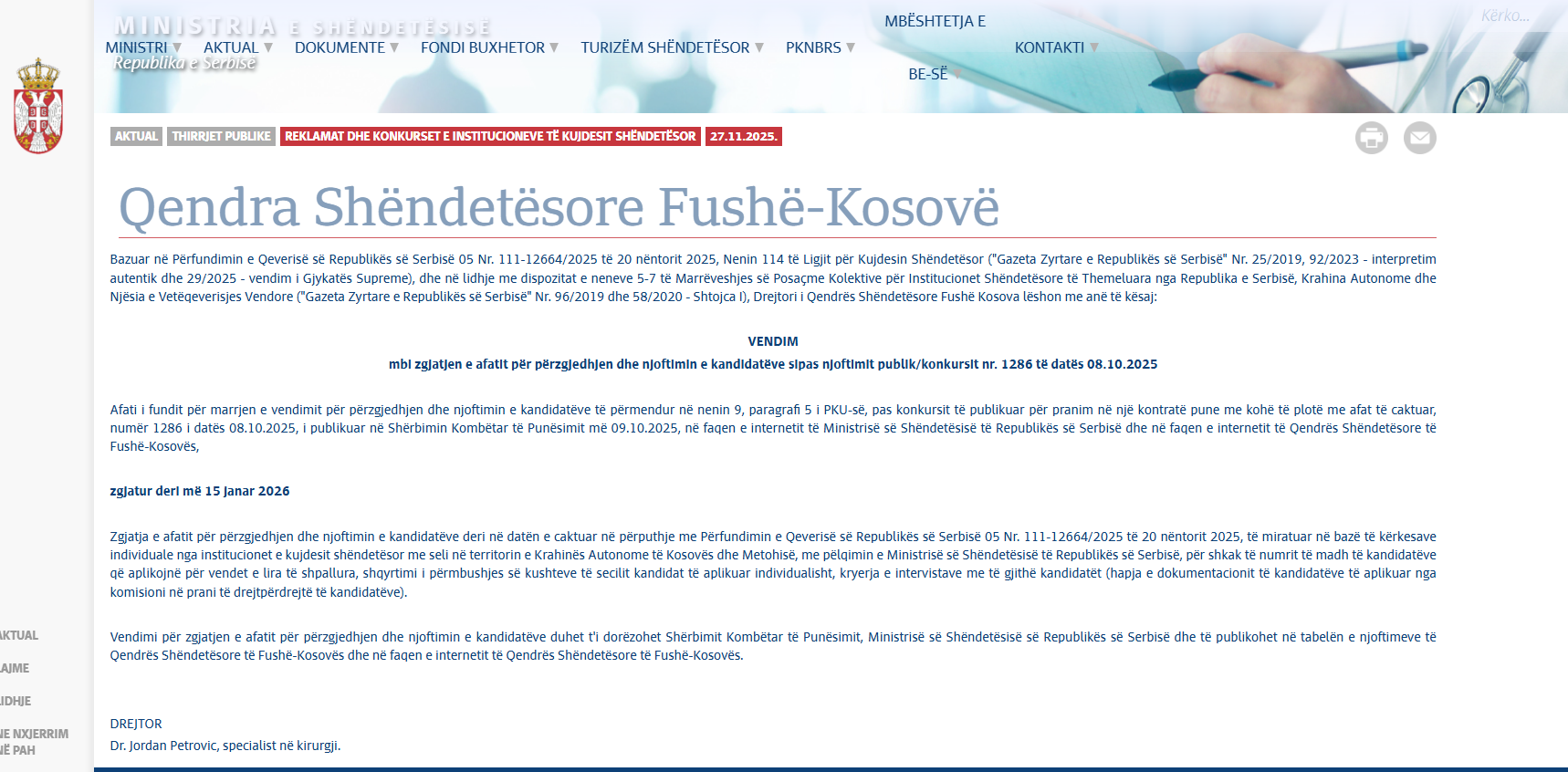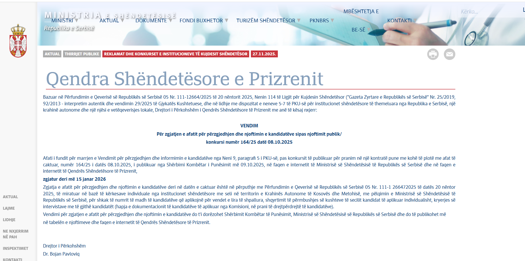 Konkursi i radhës nga Ministria e Shtetit që nuk e njeh Kosovën dhe institucionet e Kosovës, është në Qendrën Shëndetësore të Prizrenit,. Ky konkurs i hapur më 20 nëntor të këtij viti, është zgjatur afati deri më 15 janar 2026.