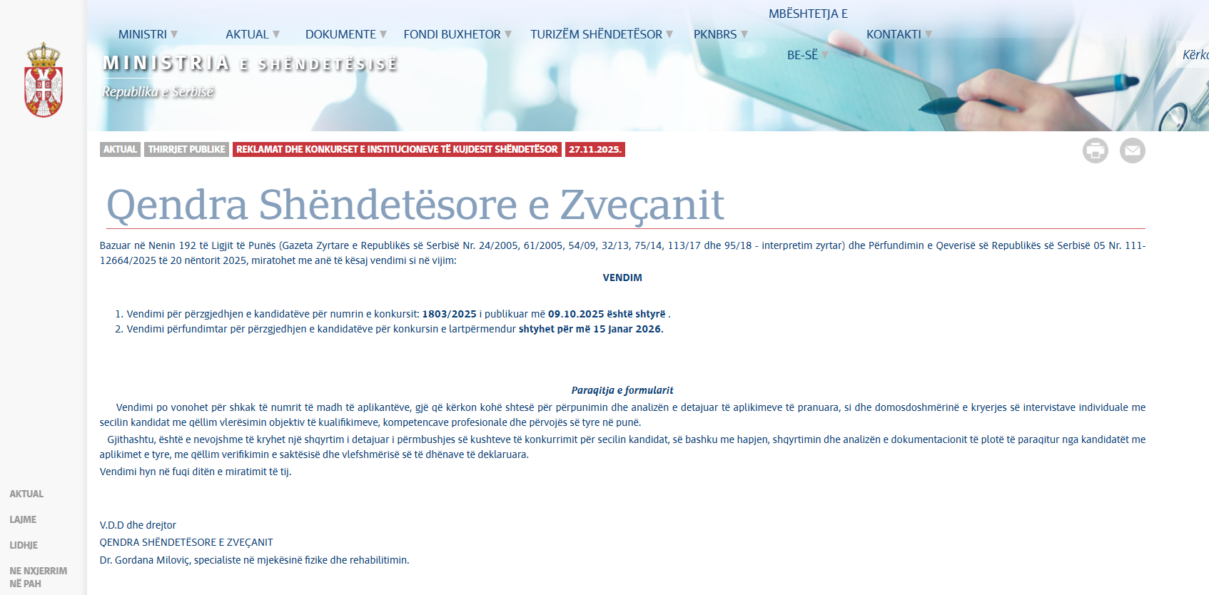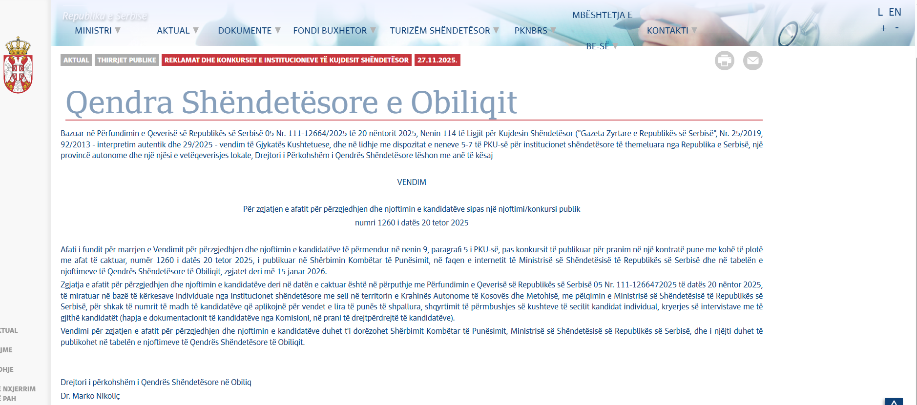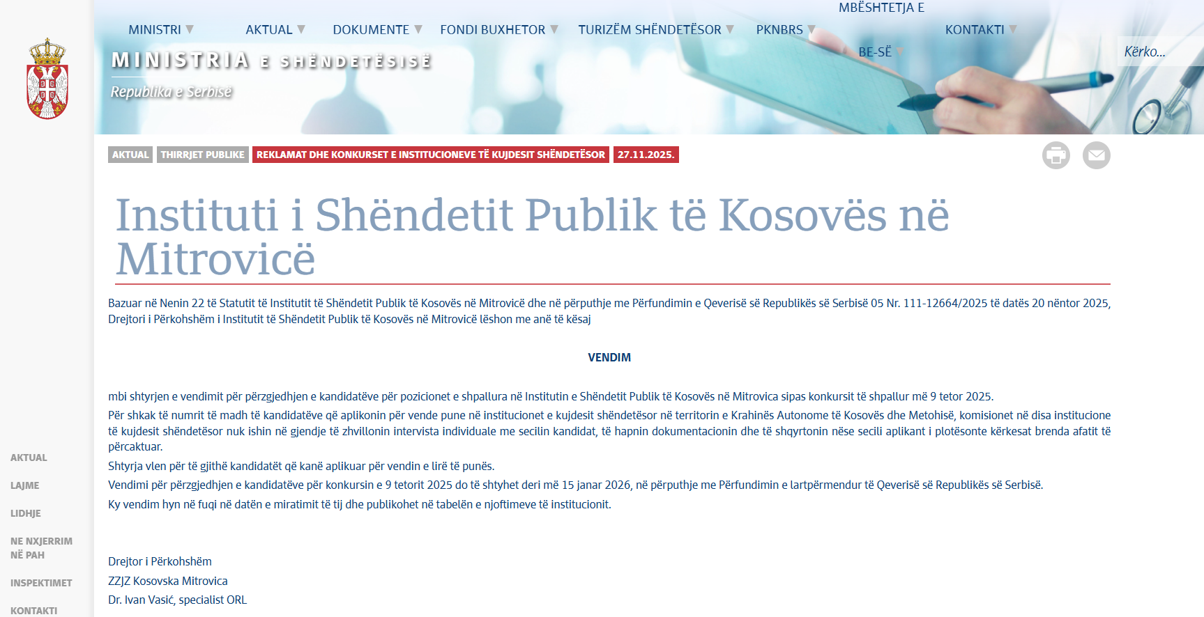 Konkursi i radhës nga Ministria e Shtetit që nuk e njeh Kosovën dhe institucionet e Kosovës, është në Qendrën Shëndetësore të Prizrenit,. Ky konkurs i hapur më 20 nëntor të këtij viti, është zgjatur afati deri më 15 janar 2026.
