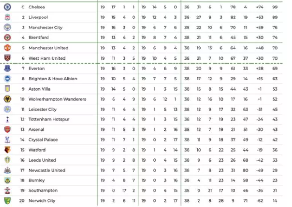 Pas tyre renditen dy rivalët Liverpool dhe Manchester City, derisa çuditërisht që ndoshta është e pabesueshme Bentford do zë pozitën e katërt, që i siguron pjesëmarrjen në Ligën e Kampionëve.
