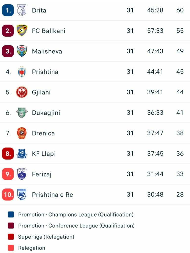 Pas përfundimit të javës së 31-të, Drita kryeson tabelën e Superligës, më 60 pikë, e ndjekur nga Ballkani me 55 sosh.