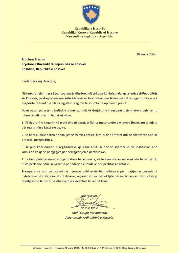 Përmes letrës së tij, Tahiri ka ngritur shqetësime për mënyrën se si janë përdorur fondet publike dhe ka kërkuar që të bëhet e ditur saktësisht sa mjete janë ndarë për realizimin e ekspozitës.
