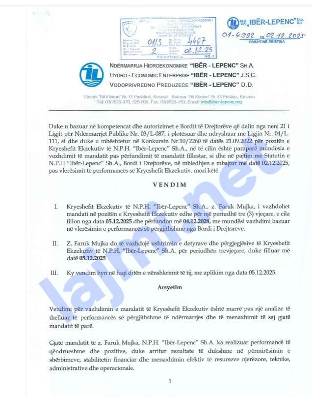 Bordi i Ndërmarrjes Hidroekonomike “Ibër Lepenci SH.A” ka marrë vendim për vazhdimin e kontratës për Kryeshefin Ekzekutiv, Faruk Mujka.