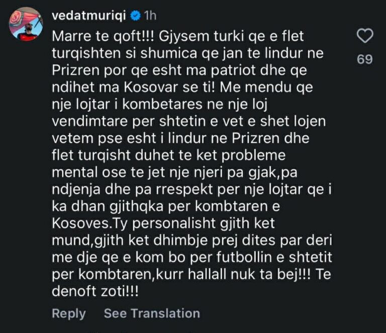 “Marre të qoft. Me mëndu qe një lojtar i Kombëtares në një lojë vendimtare për shtetin e vet e shet lojën vetëm pse është i lindur në Prizren dhe flet turqisht, duhet të ketë probleme mentale ose të jetë një njeri pa gjak, pa ndjenja dhe pa respekt për një lojtar që ka dhënë gjithçka për Kombëtaren e Kosovës”, shkroi ndër të tjera sulmuesi më i mirë që e ka pasur ndonjëherë Kombëtarja e Kosovës.