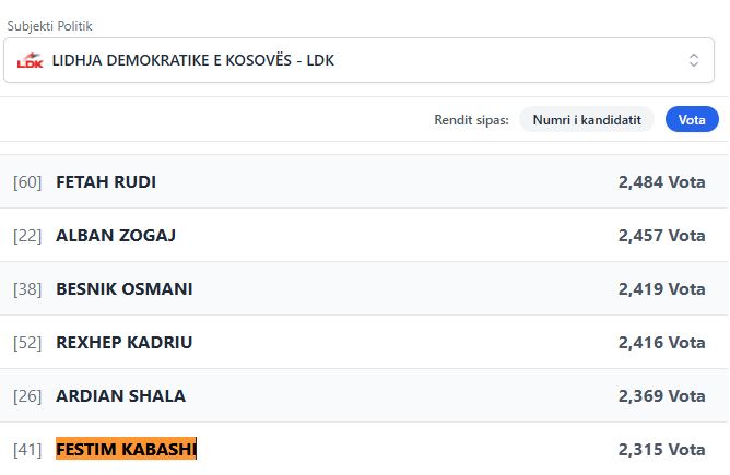 Gazetari kosovar, Festim Kabashi, i cili së fundmi iu bashkua LDK-së dhe kandidon për deputet, deri tani ka marrë vetëm 2,315 vota, raporton lajmi.net