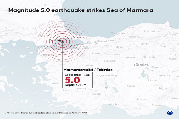 Një tërmet me magnitudë 5 ballë sipas shkallës Rihter goditi sot Detin Marmara të Turqisë, njoftuan autoritetet.