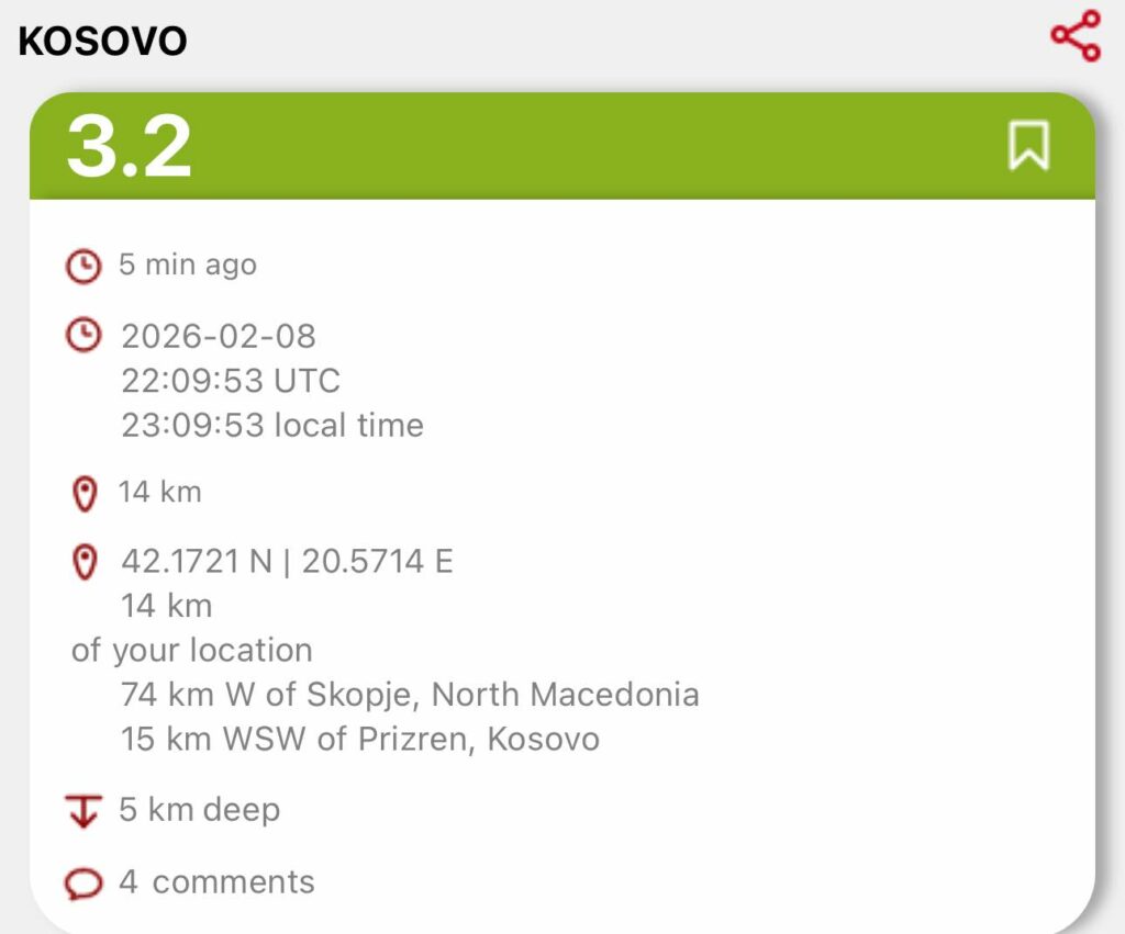 Një tërmet me magnitudë 3.2 ka goditur Kosovën sot, rreth orës 23:09. Epiqendra e tërmetit ishte rreth 15 kilometra në perëndim-jugperëndim të Prizrenit dhe 74 kilometra në perëndim të Shkupit, në një thellësi prej 5 kilometrash.