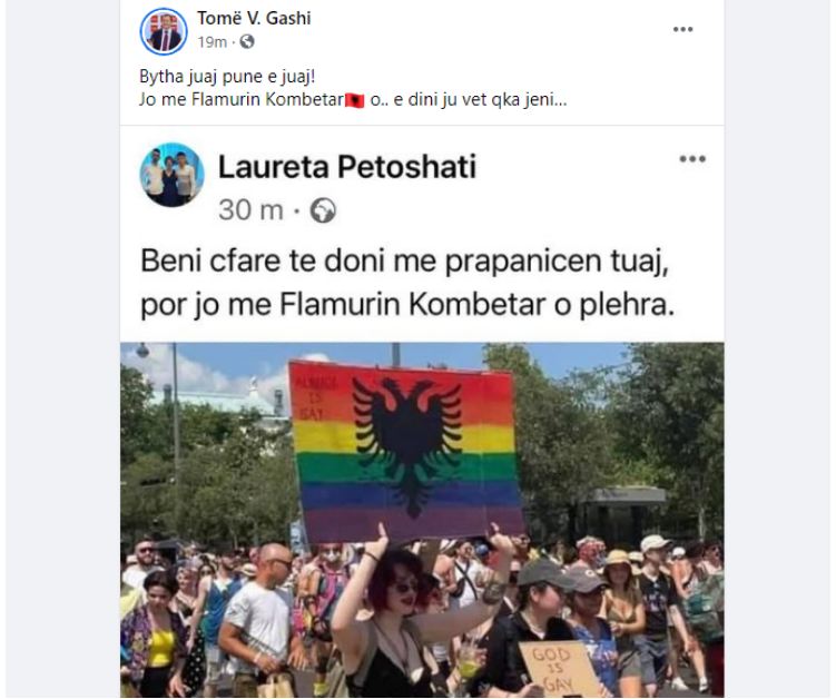 “Bytha juaj pune e juaj! Jo me Flamurin Kombetar o.. e dini ju vet qka jeni…”, shkroi Gashi.