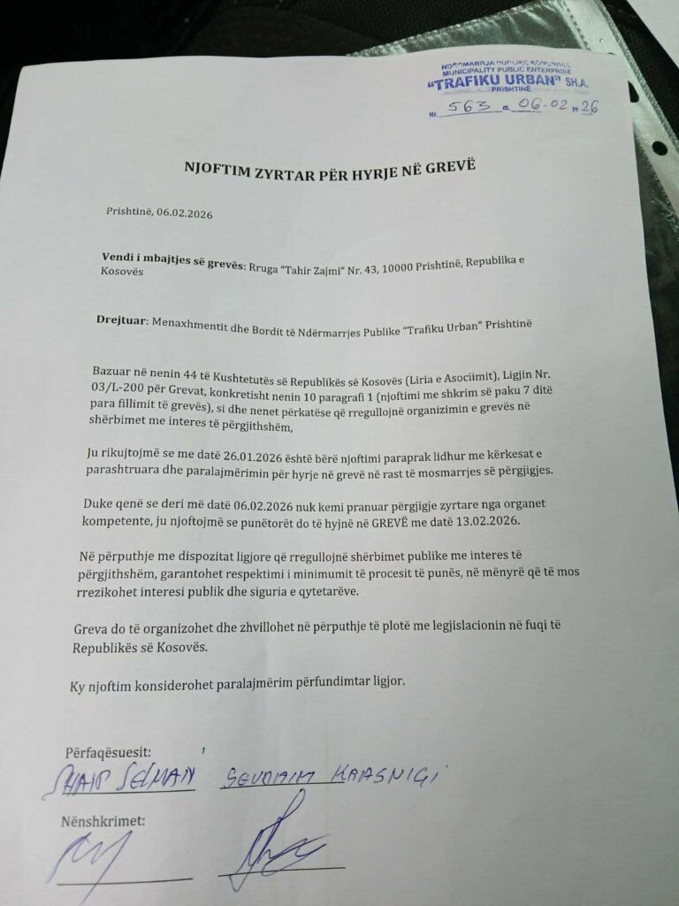 Punëtorët e ndërmarrjes publike “Trafiku Urban” në Prishtinë kanë paralajmëruar nisjen e një greve që do të fillojë më 13 shkurt 2026.