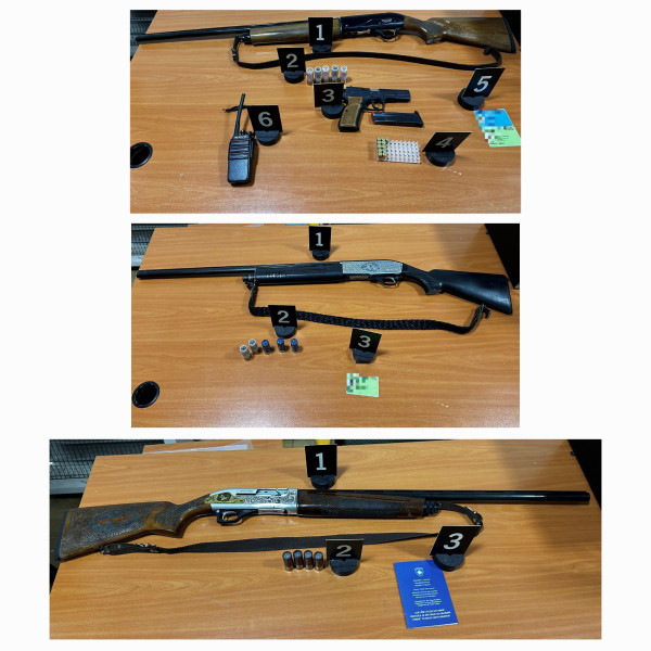 “3 pushkë gjuetie, 1 pistoletë, 25 fishekë të armëve përkatëse, 1 radiodore. Nga hetimet fillestare është konstatuar se zona ku u ndaluan të dyshuarit është zonë e mbrojtur, ku gjuetia është rreptësisht e ndaluar.