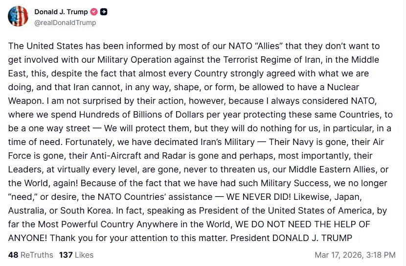 Donald Trump tha se ShBA-të janë informuar “nga shumica e ‘aleatëve’ tanë të NATO-s se nuk duan të përfshihen” në luftën e Iranit. Në një postim në Truth Social, Trump shkroi se “nuk është i befasuar nga veprimi i tyre”. “Ne do t’i mbrojmë ata, por ata nuk do të bëjnë asgjë për ne, veçanërisht, në…