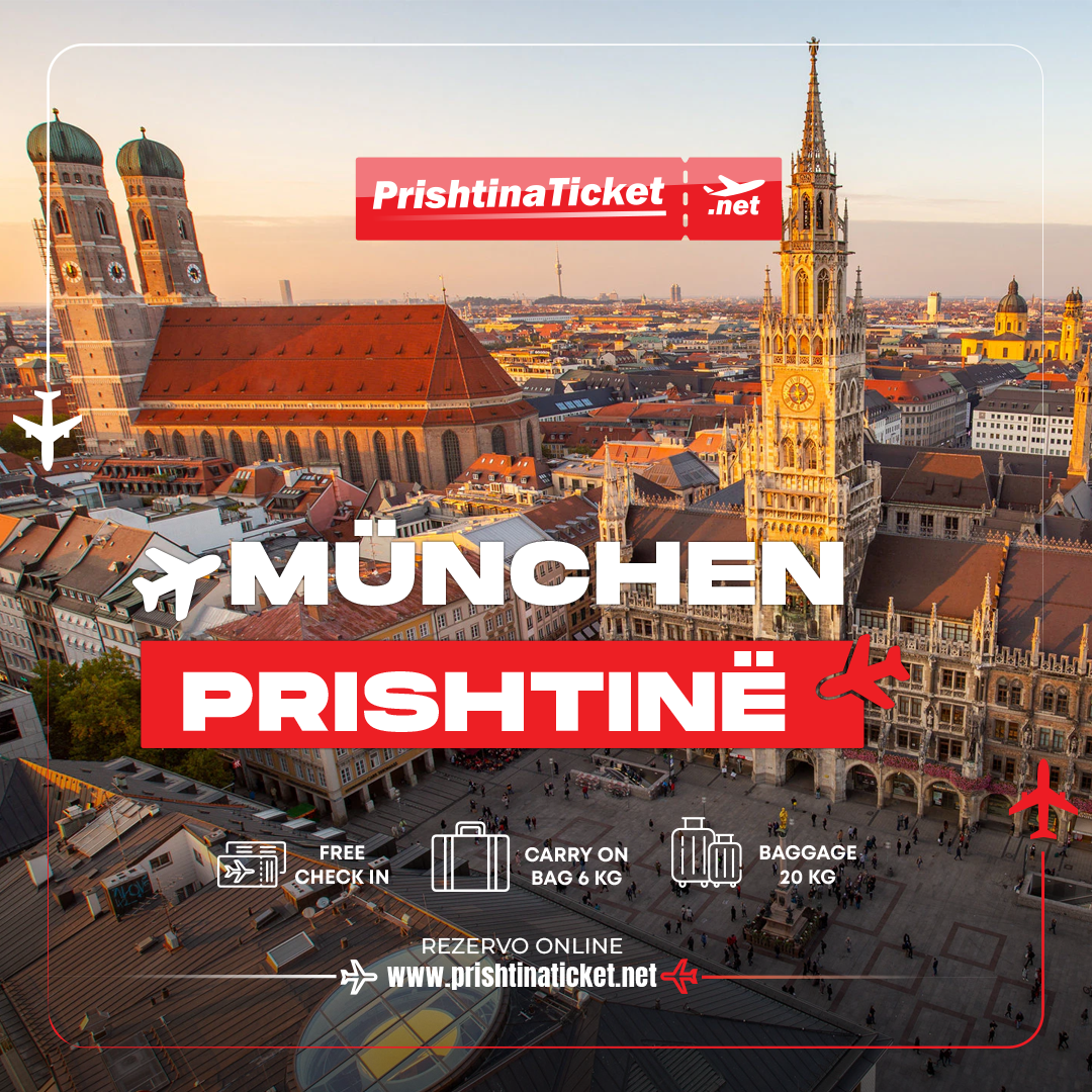 Müncheni është një destinacion që kombinon traditën bavareze me modernitetin – nga parqet e gjelbëruara dhe muzetë e njohur, te birraritë historike dhe jeta e gjallë e natës, duke e bërë çdo udhëtim një përvojë unike. Rezervoni sot me PrishtinaTicket dhe përjetoni një udhëtim të shpejtë, të sigurt dhe të rehatshëm drejt Prishtinës, çdo ditë të javës, me çmime të favorshme.