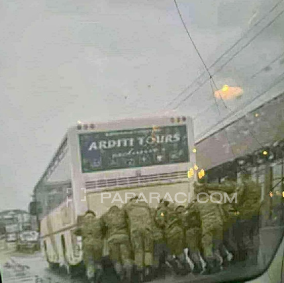 Në një fotografi të siguruar nga Paparaci, ata shihen teksa e shtyjnë autobusin në mes të rrugës.