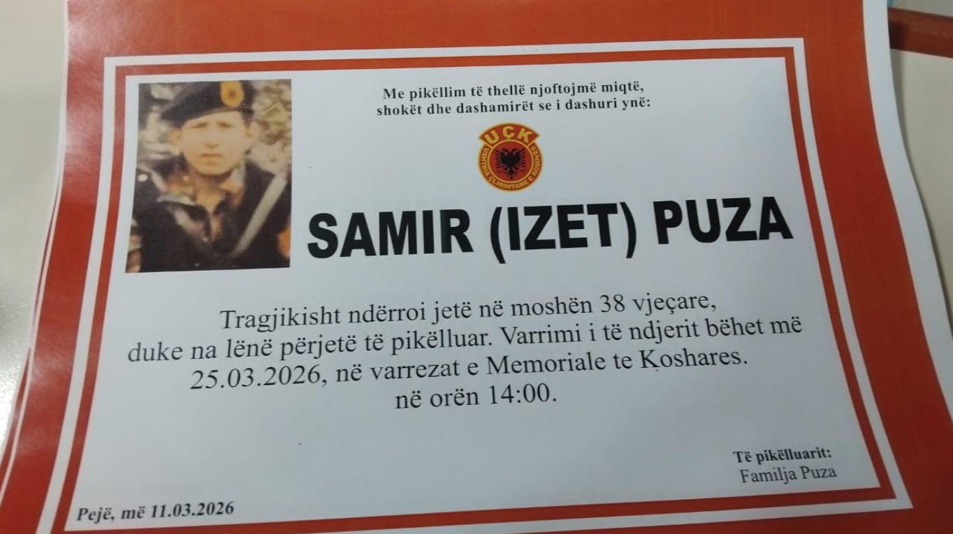 Nesër, më 25 mars do të varroset ish-ushtari i UÇK-së, Samir Puza, i cili u gjet i vdekur më 1 mars të vitit 2024 në një pusetë në Parkun “Karagaq” Pejë. Këtë e ka bërë të ditur familja e të ndjerit.l Ndërkohë, përfaqësuesi ligjor i familjes Puza, avokati Granit Cenaj deklaroi rasti i zhdukjes dhe…