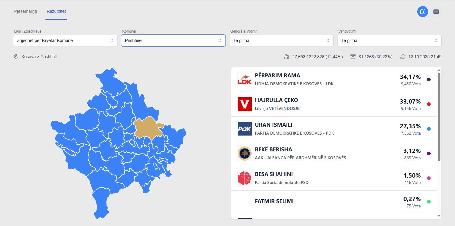 Komisioni Qendror Zgjedhor po vazhdon me publikimin e të dhënave sa i përket numërimit të votave deri më tani. Sipas të dhënave të publikuara nga KQZ-ja deri tani në komunën e Prishtinës janë numëruar 11.20% të votave, apo mbi 222 mijë vota. Sipas këtyre rezultateve del që Përparim Rama po prinë me 34.7 për qind…