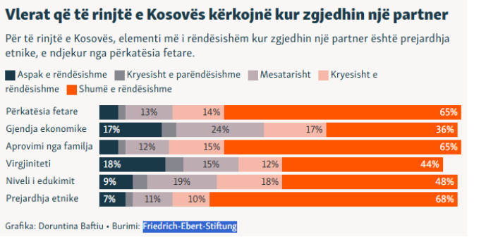 Në një grafikë të Radios Evropa e Lirë, që për burim ka të dhënat nga Instituti Friedrich-Ebert-Stiftung, listohen elementet se si të rinjtë e Kosovës zgjedhin partnerët e tyre.