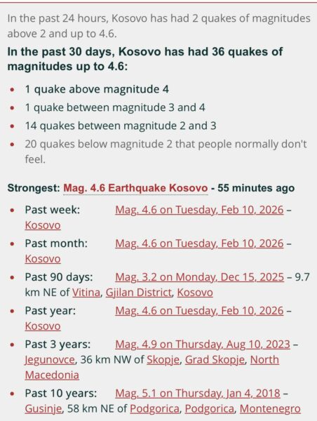Kjo faqe thotë se Në 30 ditët e fundit, Kosova ka pasur 36 tërmete me magnitudë deri në 4.6.