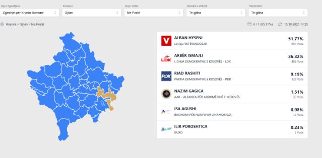 Komisioni Qendror i Zgjedhjeve ka nisur numërimin e votave me postë ku tashmë janë publikuar rezultatet e para. Nga mbi 85% e votave të numëruara me postë, Alban Hyseni i VV-së po e mposht bindshëm Arbër Ismajlin e LDK-së. Hyseni ka 51.77% të votave, kurse Ismajli renditet i dyti me 36.32%. I treti renditet Riad…