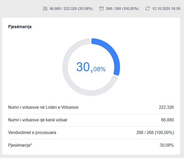Në kryeqytetin e Kosovës, Prishtinën, sipas të dhënave zyrtare të KQZ-së, deri në ora 17:00 kanë dal të votojnë 66 mijë e 880 vota apo përkthyer në përqindje 30.08%, transmeton lajmi.net.