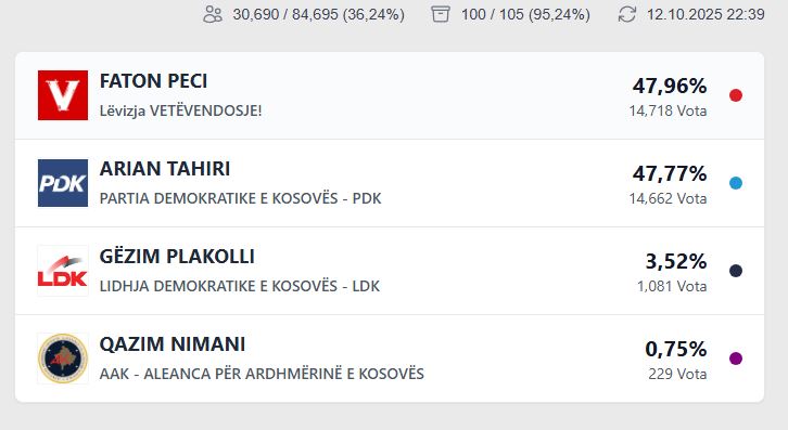 Në Mitrovicë të Jugut kanë mbetur edhe 5 vendvotime pa u procesuar. Sipas rezultati të publikuar në KQZ, Faton Peci i VV-së momentalisht është i pari me 47.96 për qind, transmeton lajmi.net. I dyti është Arian Tahiri i PDK-së me 47.77 për qind. /lajmi.net/