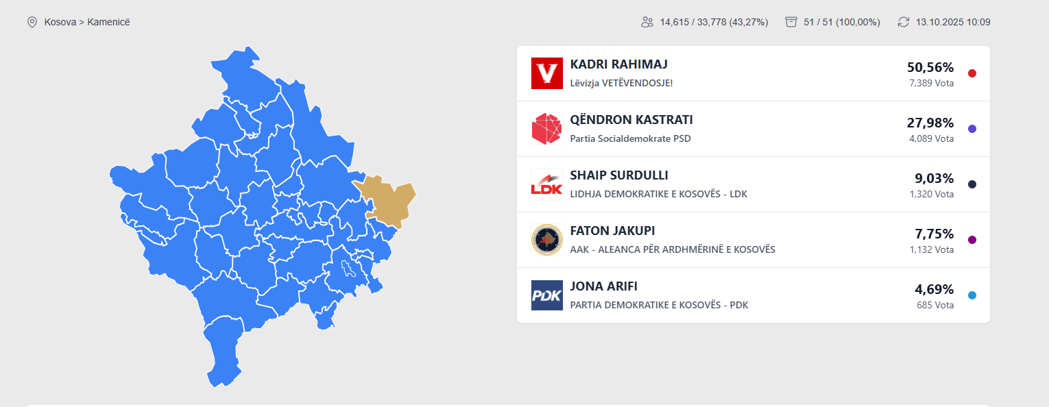 Komisioni Qendror i Zgjedhjeve, ka publikuar rezultatet e 100% të vendvotimeve në Kamenicë.