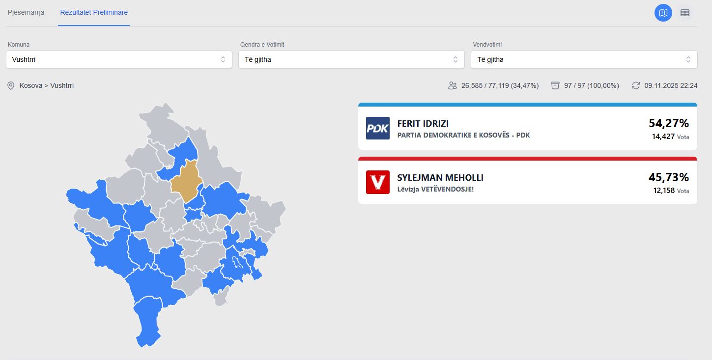 Pas procesimit të 100 për qind të rezultateve, Ferit Idrizi i PDK-së në këtë komunë ka arritur të fitoj 14 mijë e 427 vota apo 54.27 për qind, transmeton lajmi.net.