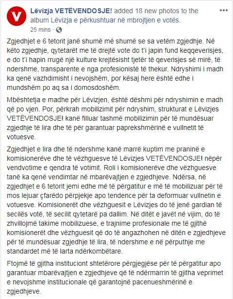 “Ftojmë të gjitha institucionet shtetërore përgjegjëse për të përgatitur apo garantuar mbarëvajtjen e zgjedhjeve që të ndërmarrin të gjitha veprimet e nevojshme institucionale që garantojnë pacenueshmërinë e zgjedhjeve”, shkruhet në postimin e VV-së.