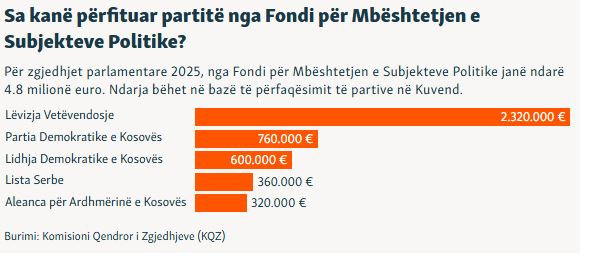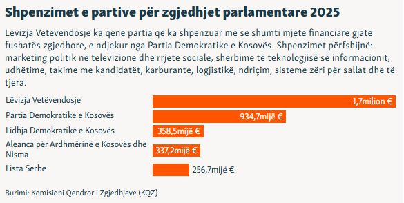 Sipas të dhënave të Komisionit Qendror të Zgjedhjeve, nga 16 gushti 2024 deri më 9 shkurt 2025, LVV ka deklaruar të hyra mbi 1.1 milion euro, PDK-ja mbi 559 mijë euro, LDK-ja mbi 94 mijë euro dhe AAK-ja mbi 18 mijë euro.