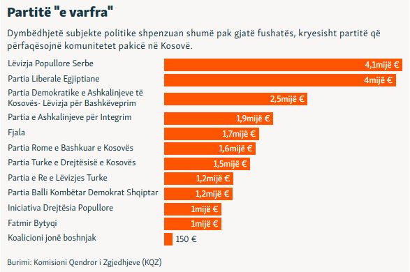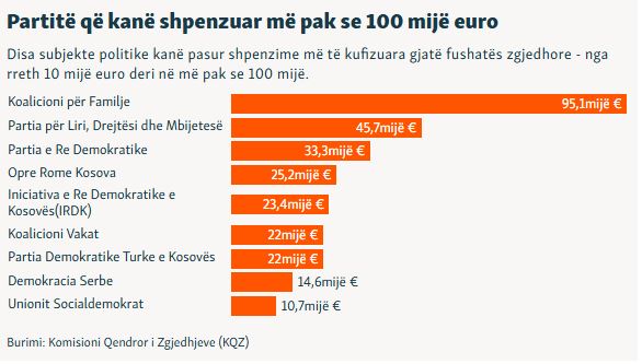 Vetëm pesë partitë kryesore – Lëvizja Vetëvendosje, Partia Demokratike e Kosovës, Lidhja Demokratike e Kosovës, Aleanca për Ardhmërinë e Kosovës/Nisma dhe Lista Serbe – shpenzuan rreth 3.6 milionë euro, sipas të dhënave që publikoi Komisioni Qendror i Zgjedhjeve.