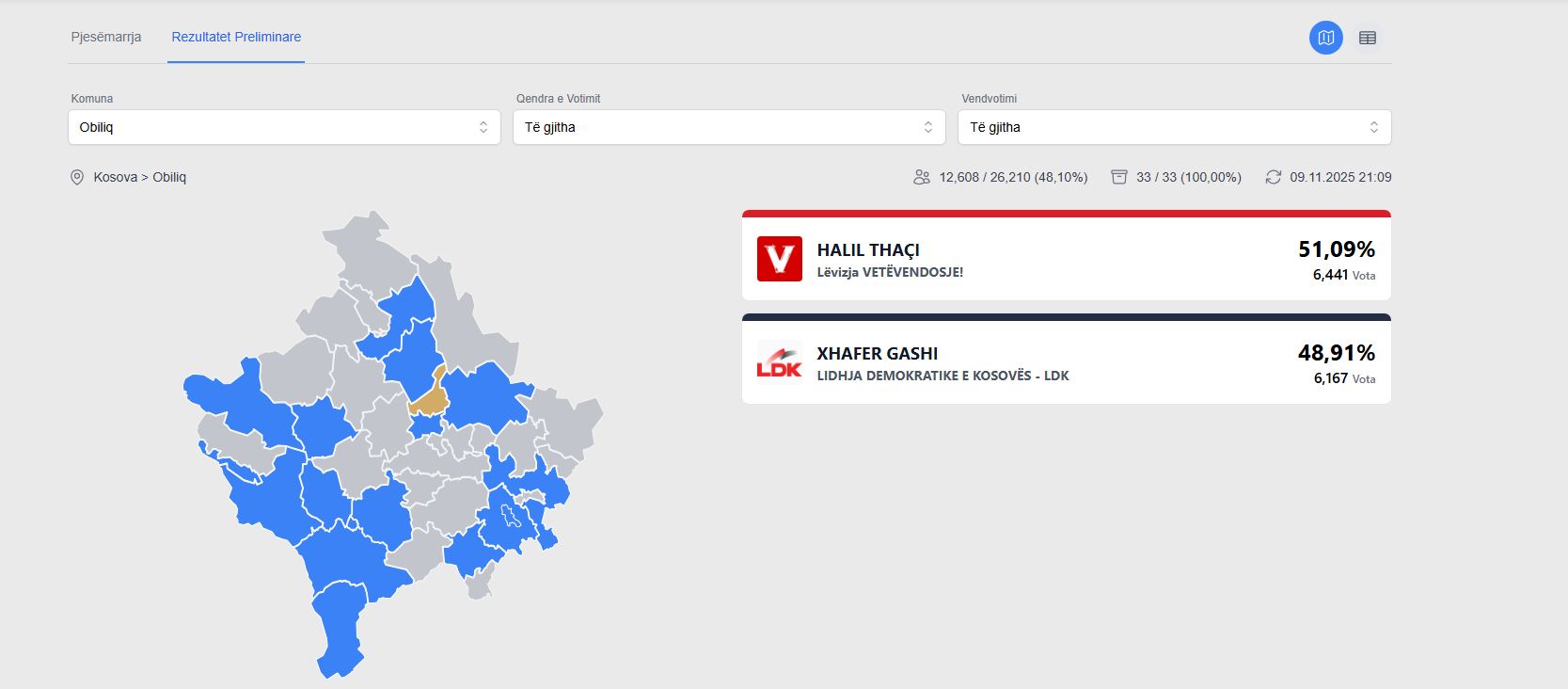 Janë procesuar 100 për qind të votave në komunën e Obiliqit. Fitues në këtë komunë edhe zyrtarisht është Halil Thaçi nga Lëvizja Vetëvendosje, transmeton lajmi.net. Thaçi ka 6 mijë e 441 vota po 51.09 për qind. Ai fitoj kundër Xhafer Gashit të LDK-së. Gashi ka fituar 6 mijë e 167 vota apo 48.91 përqind./lajmi.net/