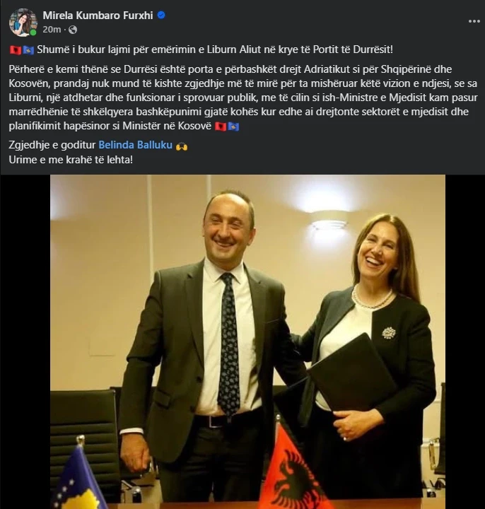 “Përherë e kemi thënë se Durrësi është porta e përbashkët drejt Adriatikut si për Shqipërinë dhe Kosovën, prandaj nuk mund të kishte zgjedhje më të mirë për ta mishëruar këtë vizion e ndjesi, se sa Liburni, një atdhetar dhe funksionar i sprovuar publik, me të cilin si ish-Ministre e Mjedisit kam pasur marrëdhënie të shkëlqyera bashkëpunimi gjatë kohës kur edhe ai drejtonte sektorët e mjedisit dhe planifikimit hapësinor si Ministër në Kosovë”, ka shkruar ajo.