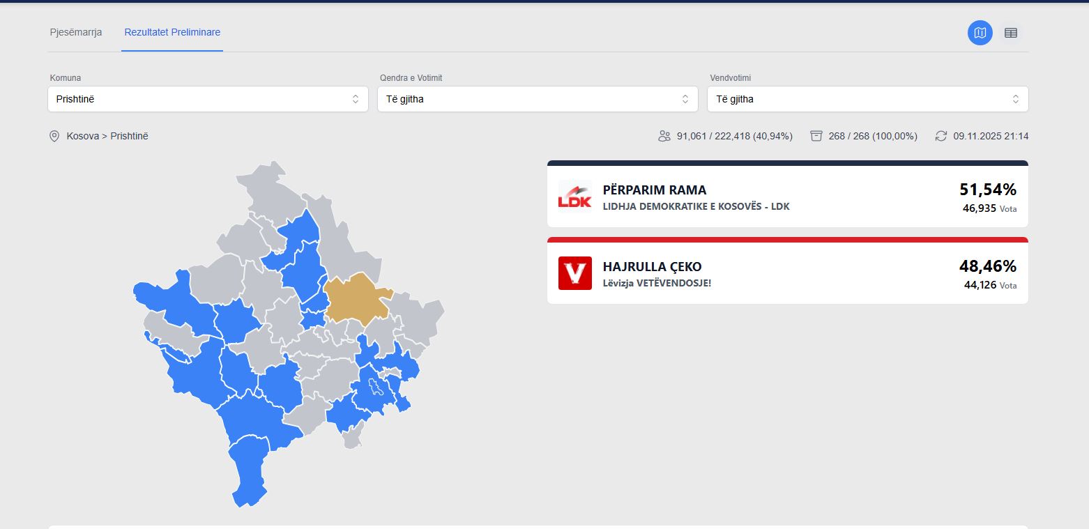 Ka përfunduar numërimi në komunën e Prishtinës. Zyrtarisht, Përparim Rama i LDK-së do të jetë kryetar i Prishtinës edhe për 4 vjet, transmeton lajmi.net. Rama ka fituar 51.54 për qind apo 46 mijë e 935 vota. Kundërkandidati i tij Hajrulla Çeku i VV-së ka fituar 48.46 përqind apo 44 mijë e 126 vota./lajmi.net/